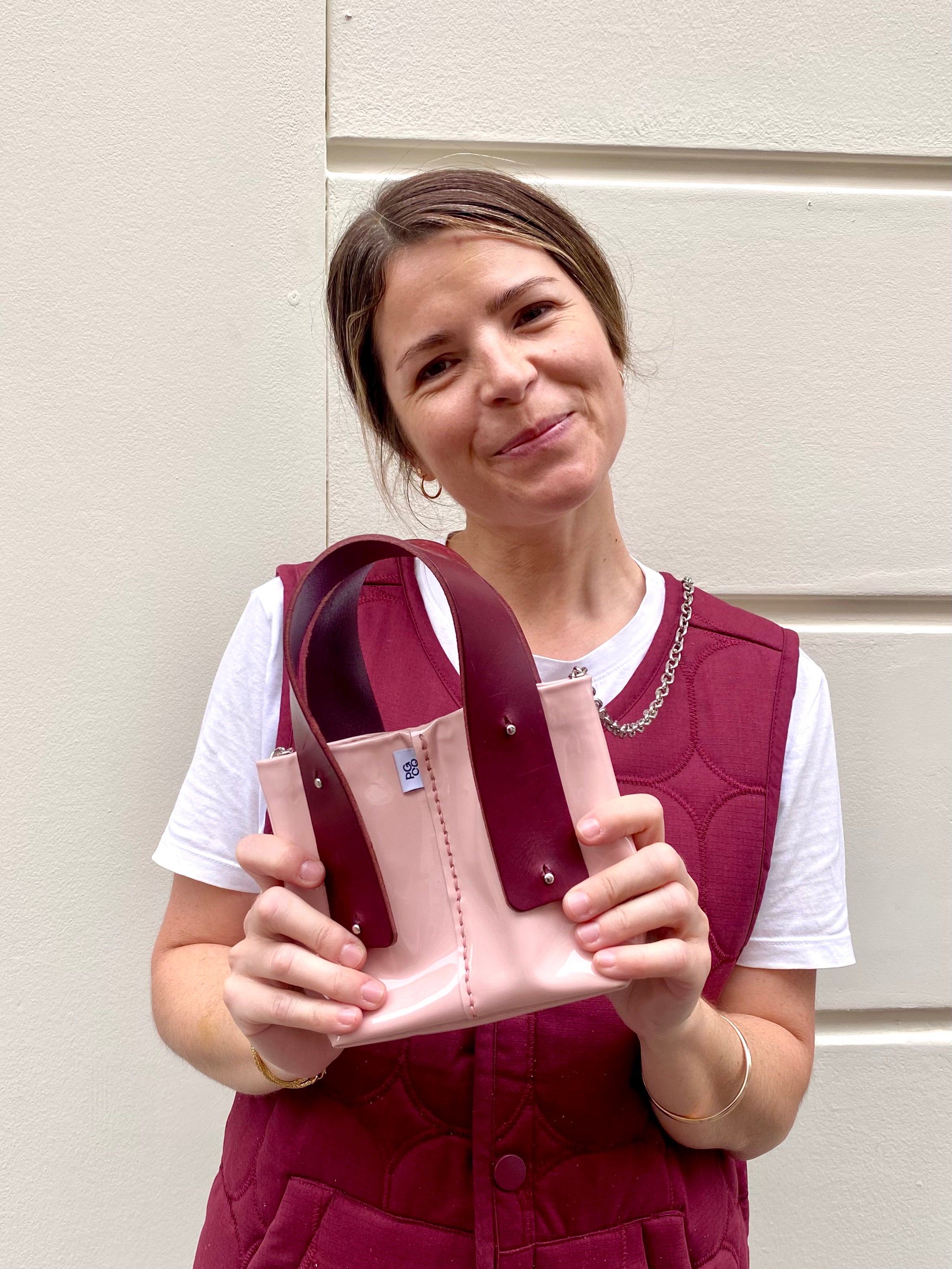 Juliette réalise son tout premier sac, à partir de cuirs de seconde main sourcés dans une recyclerie.